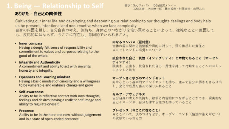 IDGsのワーキングチームは、数か月かけて有識者の意見を集め、調査をし、2021年秋にIDGsの改訂版(完成版)を発表しました。内的成長課題は、5つのカテゴリーと23のサブカテゴリーで成り立ちます。(以下の翻訳はSoLジャパンの有志によるものです)