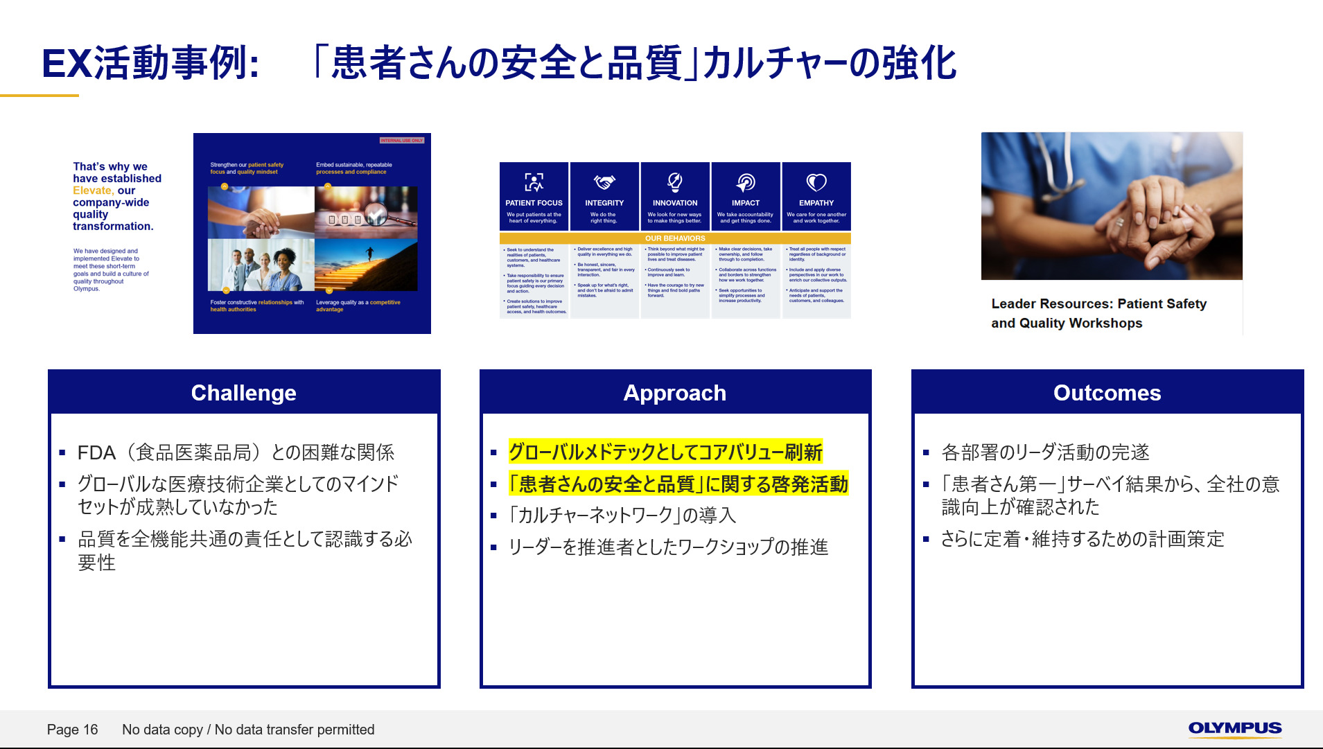 そして、策定してから数年しかたっていないコアバリューを「グローバルメドテックカンパニー」として必要な形に見直し、全社で展開しました。医療従事者の方と直接コミュニケーションする機会が多い営業や開発だけではなく、会社全体で「患者さんの安全と品質」を しっかり考えられる会社になろうと考え、それを感じられるEX施策を全社で推進していきました。
