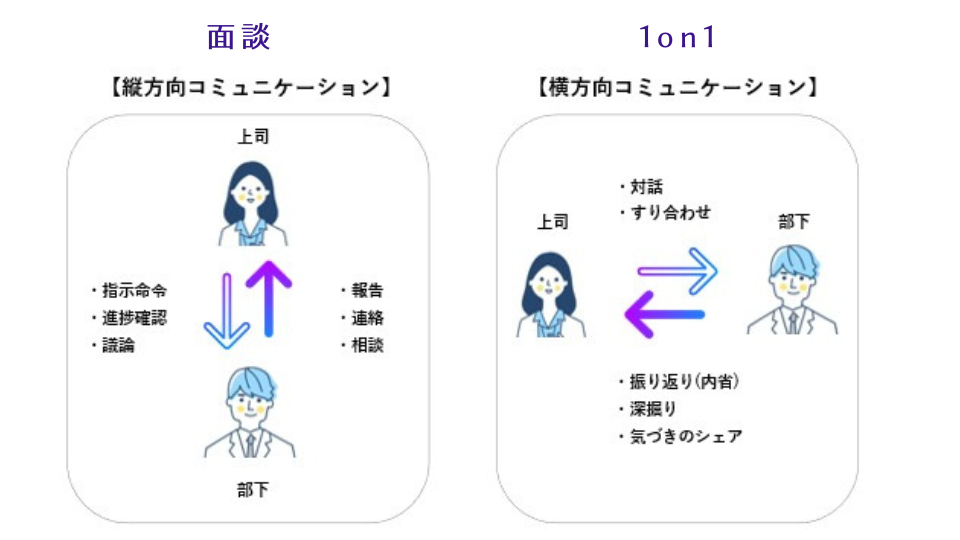 • 1on1:部下の育成が目的。部下が自分の思考を整理し、上司は対話を通して、その手助けをする「横方向のコミュニケーション」が中心になる。
