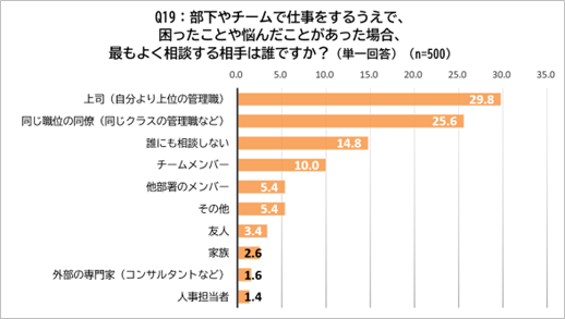 困ったことや悩んだことについて誰にも相談しない層は 14.8%に対し、同じ職場の人(上司、同じ職位の同僚、チームメンバー等)に相談する層は 72.2%となります。職場内で課題解決をしていくにあたって、上司や同僚チームメンバーなどに相談しながら、取り組んでいる管理職が多いという結果でした。