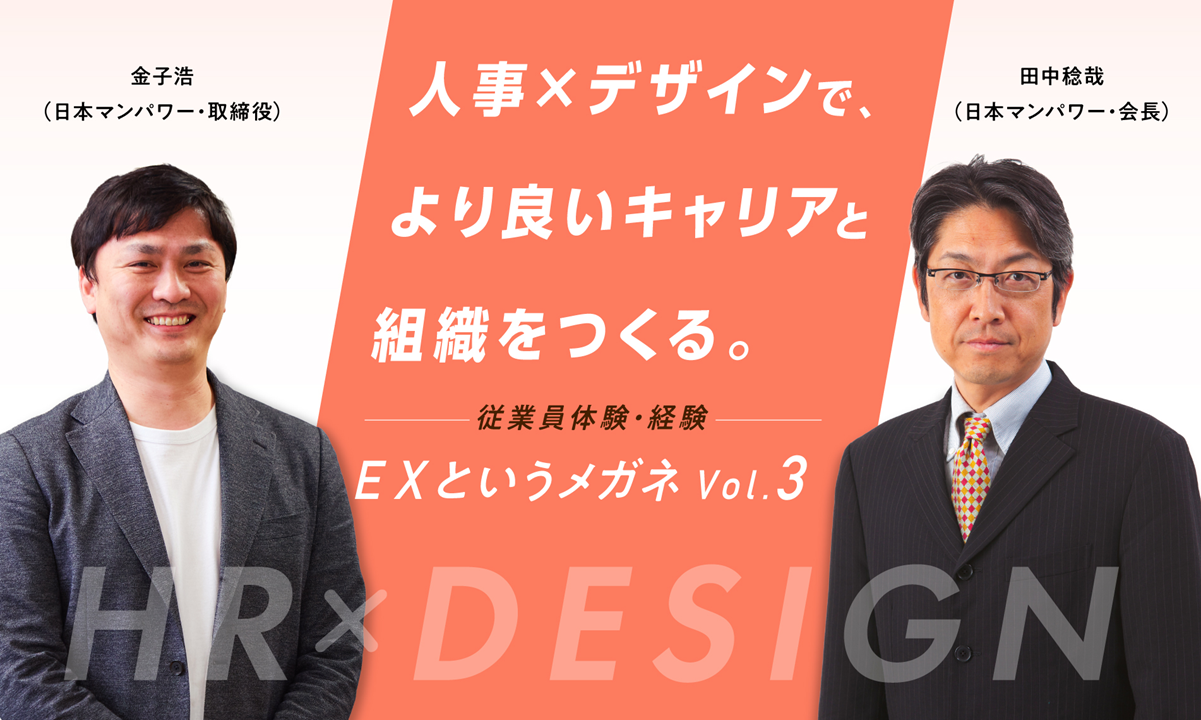いま、広がりを見せているEX(従業員体験・経験)というメガネを通じて「働き方のこれから」「キャリアのこれから」「人事のこれから」「社会のこれから」を見通していく本連載。第3回は、人事領域とデザイン領域の方々が共にEXについて探求する「HRとEX のデザイン研究会」に参加した田中稔哉(日本マンパワー会長)と金子浩(同・取締役)にインタビューをしました。人事とデザインというまったく異なる領域が共創する意味、デザインのプロセスとネガティブケイパビリティの親和性・・・・EXというメガネを通じて多角的にキャリア、組織や学習を検証する場となりました。